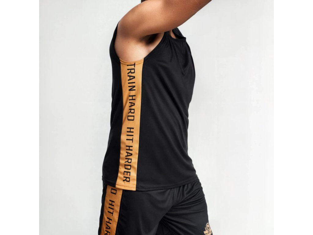 Na bocích trika je vytištěné motto „TRAIN HARD. HIT HARDER.“ – připomínka, že pot na tréninku přináší vítězství v ringu.